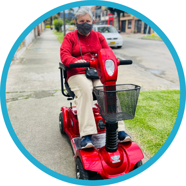 Scooter eléctrica todoterreno, con freno automático (electromagnético), sistema de luces incorporadas, reclinación manual de espaldar, desmontable en dos piezas (estructura y silla), máxima duración de carga (autonomía) y baterías recargables, para una mejor movilidad independiente.