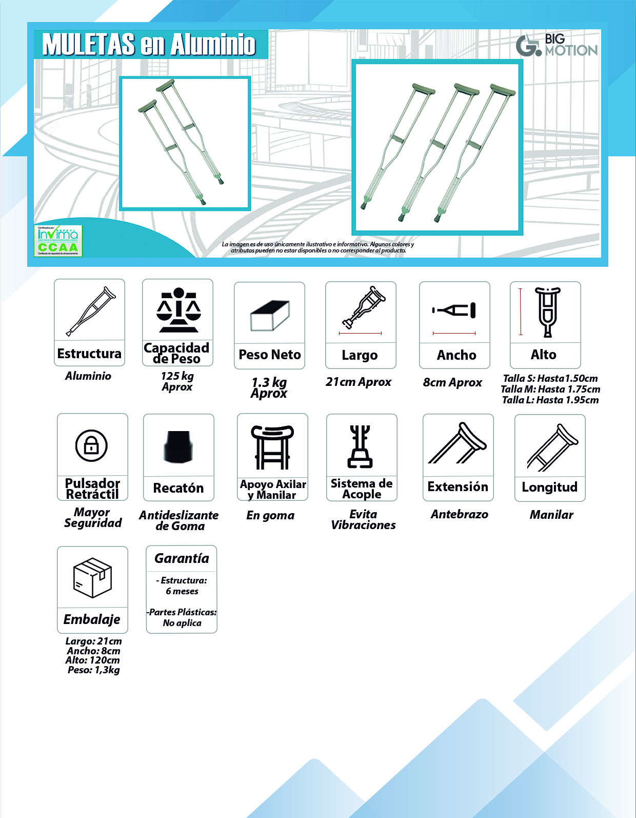 Par de Muletas talla S, M y L en estructura de aluminio anodizado resistente y ligero, apoyo axilar y manilar en goma acolchonado antideslizante y base con tapón en goma antideslizante evita vibraciones, adecuado para personas con movilidad reducida.