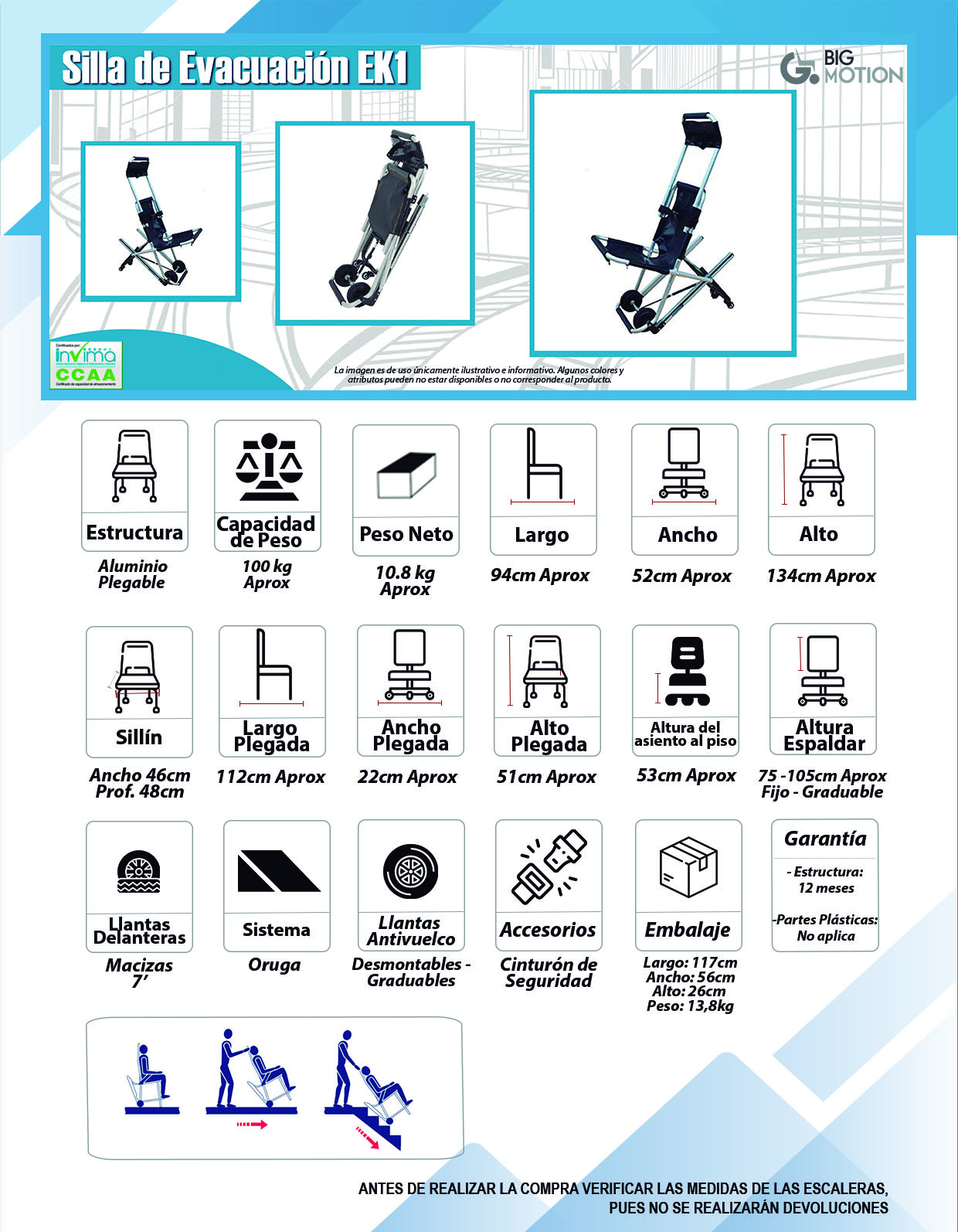Silla de evacuación y emergencia en estructura de aluminio, con sistema oruga, plegable y equipado con características de seguridad para proporcionar un medio rápido, seguro y confiable de evacuación (únicamente para descensos). Este tipo de silla se caracteriza por su peso ligero, resistente y de fácil uso.