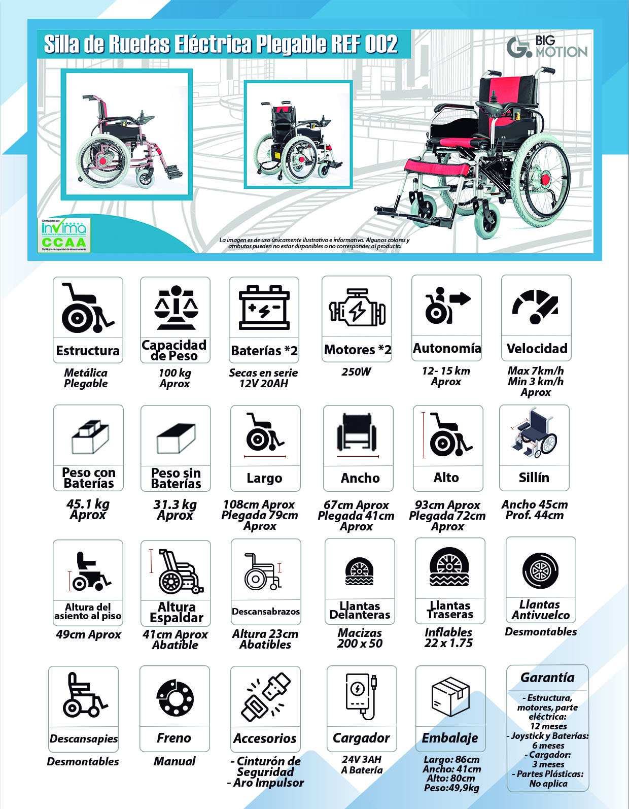Silla de ruedas eléctrica liviana en estructura de aluminio, con freno...
