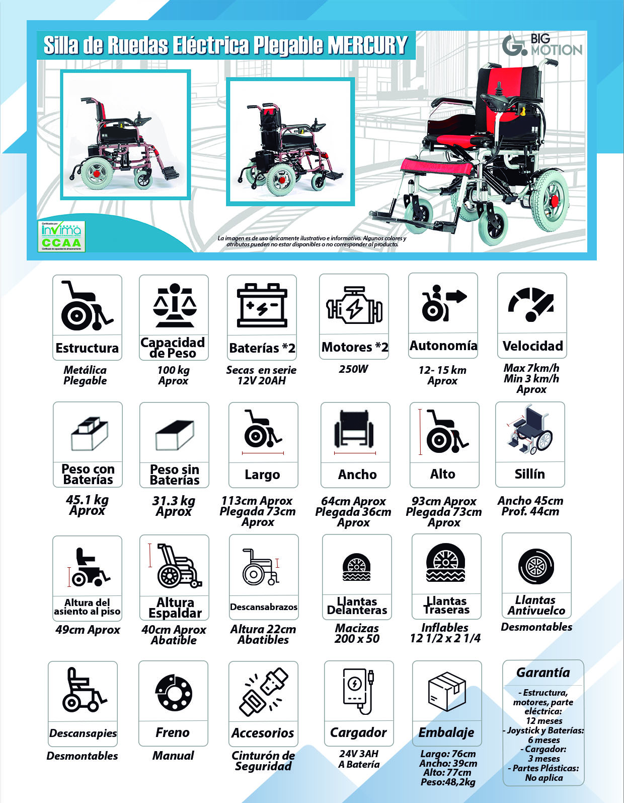 Silla de ruedas eléctrica liviana en estructura de aluminio, con freno...