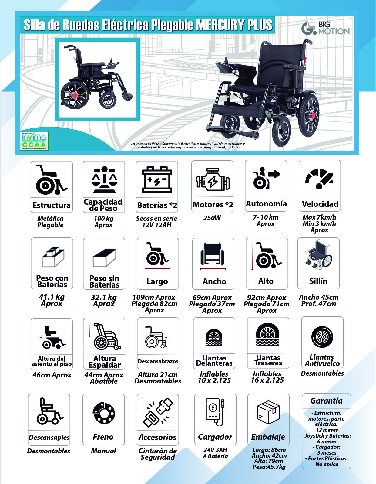 Silla de ruedas eléctrica liviana en estructura de aluminio, con freno...