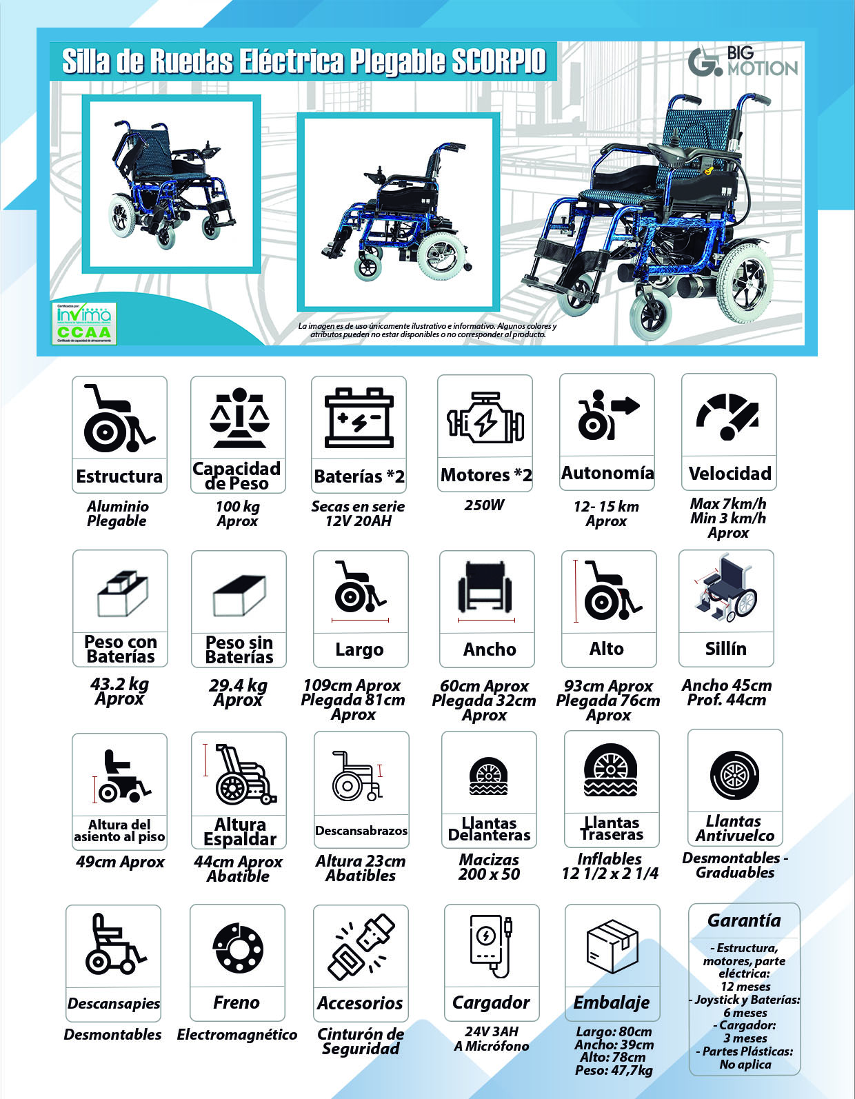 Silla de ruedas eléctrica liviana en estructura de aluminio, con freno...