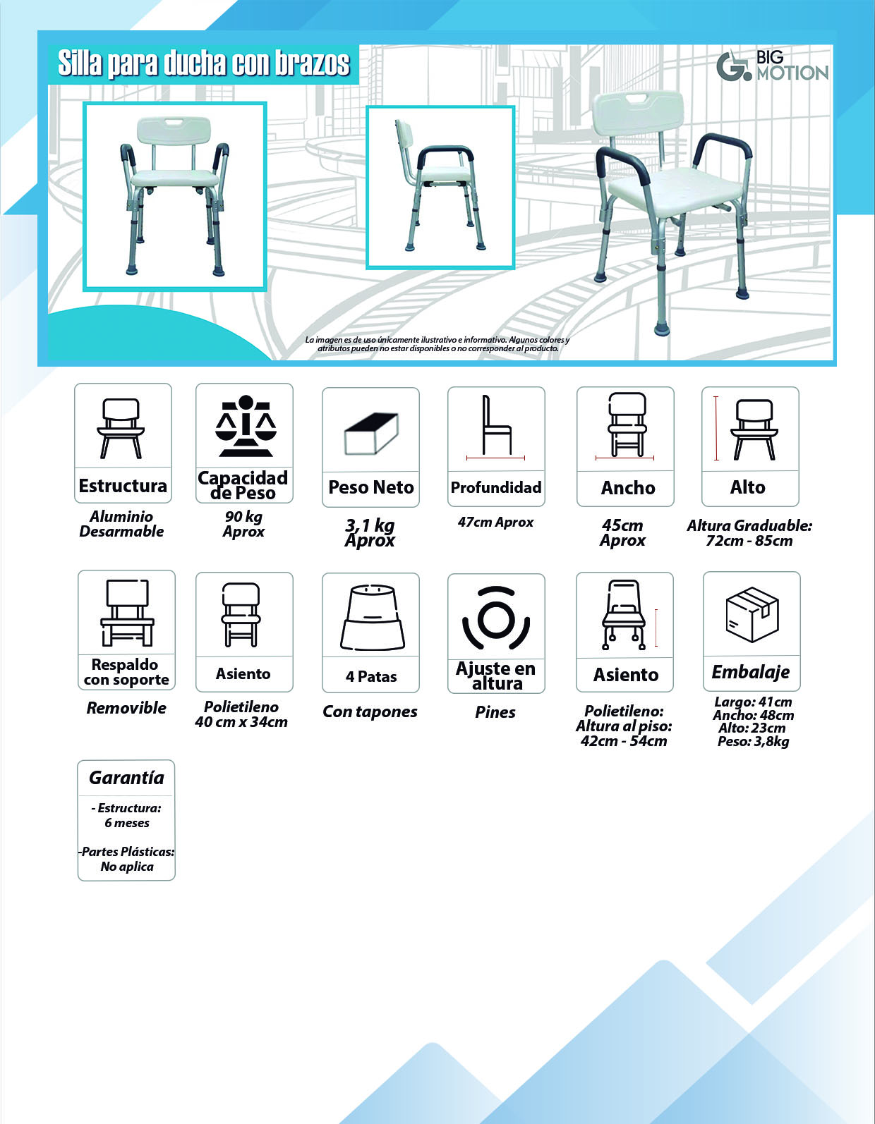 Silla para ducha con apoyabrazos en estructura de aluminio, plegable, tapones antideslizantes y asiento en polietileno, para un mejor estilo de vida diaria, facilitando procesos de rutinas de higiene en las personas con dificultad de desplazamiento.